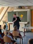 Herr Völkel nahm uns mit auf eine Reise durch das Universum. Er erklärte die verschiedenen Planeten in unserem Sonnensystem, hervorgehoben wurde hier der Jupiter, welchen man am Abend mit bloßem Auge gut am Himmel sehen konnte. Er zeigte den Schülern, wie man den großen Wagen am Himmel findet und davon ausgehend den Polarstern, den kleinen Wagen, die Kassiopeia und weitere Sternbilder. Herr Völkel erklärte den Schülern die unterschiedlichen Anziehungskräfte, welche die Erde und der Mond haben. Die Erdanziehungskraft ist nämlich sechsmal so groß wie die des Mondes. Im Video über die Mondlandung konnte man sehr gut sehen, wie schwer es den Astronauten fiel, wegen der geringeren Anziehungskraft, auf dem Mond zu laufen.